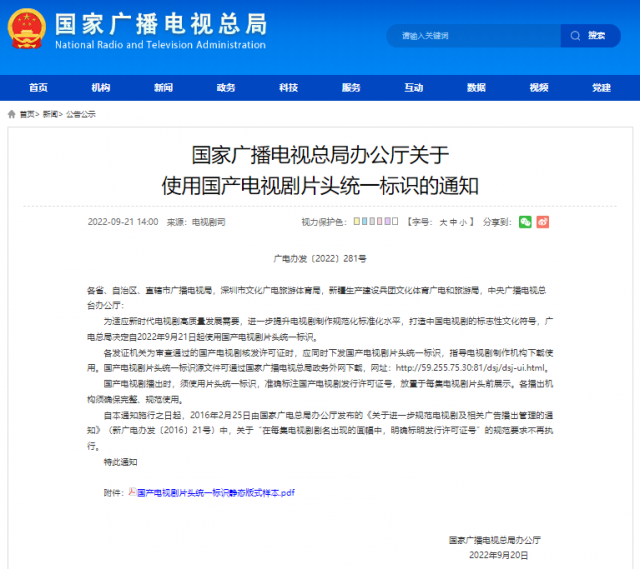 9 月 21 日消息,据国家广播电视总局消息,为适应新时代电视剧高质量发展需要,进一步提升电视剧制作规范化标准化水平,打造中国电视剧的标志性文化符号,广电总局决定自 2022 年 9 月 21 日起使用国产电视剧片头统一标识。