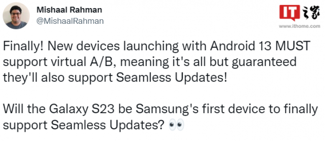 而据 Mishaal Rahman 称,到了 Android 13,传统的 OTA 更新机制已被弃用,供应商测试套件 (VTS) 中添加了新的测试,必须支持虚拟 A / B 分区,且这些测试已在 Android 13 正式版发布前被合并,所以这次的推广决心比 Android 11 要强得多。