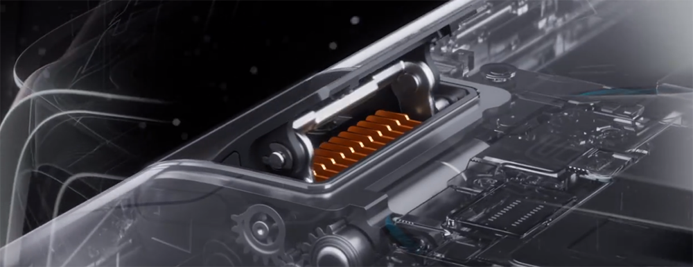 酷冷风洞阀的灵感汲取自ROG电竞笔记本设计,表面为不锈钢材质,由50+精密部件组成,转轴部分经过了液态金属压铸,开合使用寿命高达4万次以上,耐用性极强。内部的鳍片式微型真空腔VC均温板一端与SoC直接相连,当开启ROG酷冷风扇6时,酷冷风动阀在步进式马达配合下也会自动开启,借由真空腔均温板的高导热性特质,可以将CPU产生的热量传导至鳍片上,再通过风扇对流(每秒将有1000ml的冷空气吹向鳍片),直接将热量排出,完成对SoC的强效制冷。