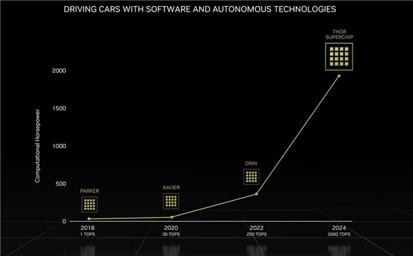 NVIDIA昨晚发布了RTX 40系列显卡,这是游戏玩家最关注的产品,但对汽车用户来说,NVIDIA发布的Thor(雷神索尔)自驾芯片才是王炸,其性能达到了2000TFLOPS,是目前Orin芯片的8倍。