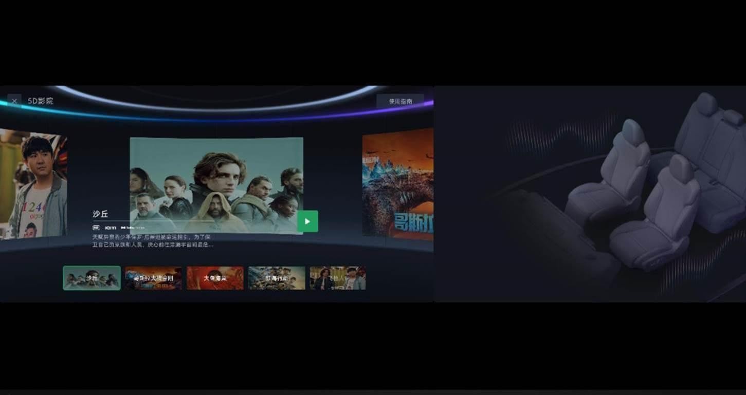 将车内观影的体验从单纯视听延伸至整个座舱内沉浸感受,这在业内尚属首次。首批随车上线的定制影片包括《沙丘》《哥斯拉大战金刚》《大鱼海棠》《红海行动》《飞驰人生》。片单中既有浩瀚广袤的沙漠画面,也有惊险刺激的赛车场景;既有深邃静谧的深海故事,也有热血战场的枪林弹雨……多样化的场景充分调动车内软硬设施,用户置身车内,即可随座椅震动体验刺激的搏斗;随空调冷热风拂面,用户也能体验主角深入沙丘身处的燥热与下潜深海的清冽。