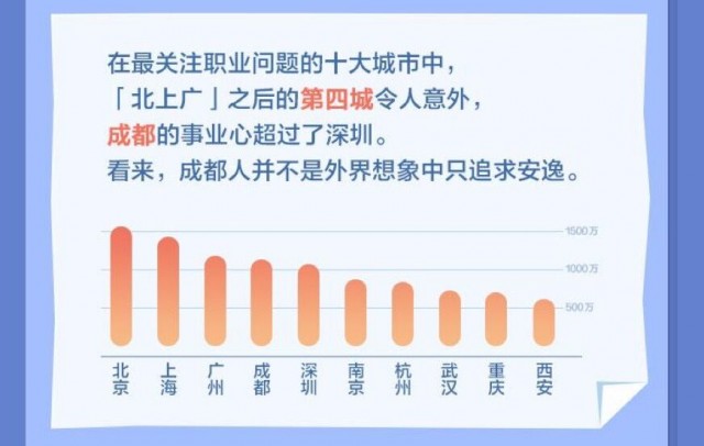 在最关注职业问题的十大城市中,北京、上海、广州稳居前三,然后最有事业心的第四城令人意外,成都排名超过深圳,位居第四。看来,成都人并不是外界想象中只追求安逸。