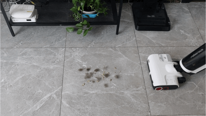 当然,日常生活中地上主要的垃圾是灰尘、零食碎屑等大大小小的干垃圾,对此,小编用粉末、咖啡豆、纸屑等模拟日常生活中的干垃圾,测试一下石头智能洗地机 A10 Plus的清洁能力。在实测的过程中,对于而地面的垃圾、水渍会被两排滚刷聚拢在滚刷中间,迅速被卷入到滚刷上方,在中央风道的17000Pa大吸力下,再被风道吸入污水箱,整个过程还是迅速且利索的。