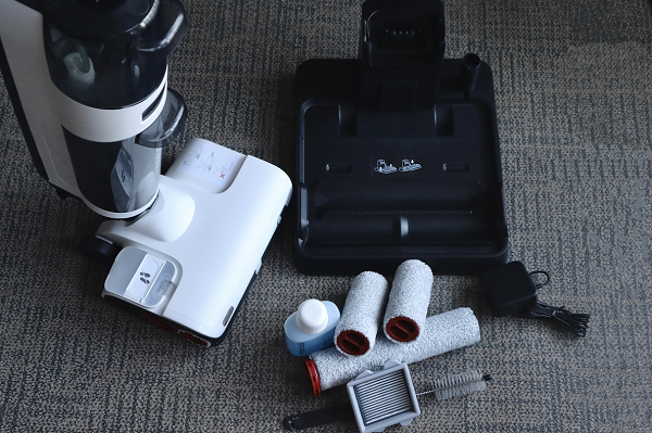 配件方面,石头智能洗地机 A10 Plus除了一个充电底座,还提供了用于自清洁、烘干的充电收纳座、清洁毛刷、电源、额外的一套滚刷、滤网以及抗菌清洁剂。