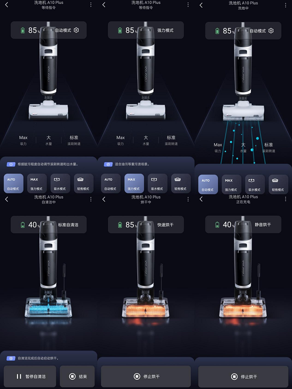 关于自清洁,石头智能洗地机 A10 Plus 还提供了标准自清洁和强力自清洁两种不同的档位,强力自清洁更适合厨房重油污等场景。实测中,在石头智能洗地机 A10 Plus 加入专用清洁剂,然后放入底座,选择按下自清洁按钮,就完成了全部工作。自清洁过程中,石头智能洗地机 A10 Plus 会自动判断刷头的脏污程度,来决定自清洁时间,然后会通过双向旋转方式洗拖布。