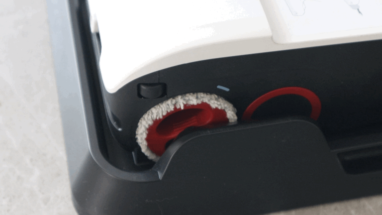 自清洁完成后,还可以选择烘干。充电底座上有一拍密集的圆柱形热风出口,工作时,两排滚刷会固定在该区域,然后通过出风口的热风,将滚刷烘干。底座的背面,还有一个专门的散热孔。在实测的过程中,烘干结束后,可以看到刷头十分干燥。