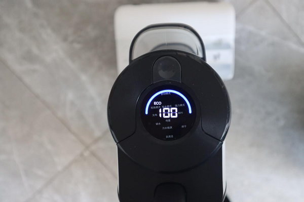 智能LED 显示屏位于水桶顶部,正常握持下可以轻松的看到屏幕内容。屏幕可以显示电量、工作模式以及水箱和污水盒情况,配合上语音提示功能,在切换清洁模式、充电、烘干等功能时都会提醒,可以方便用户第一时间轻松掌握洗地机状态。