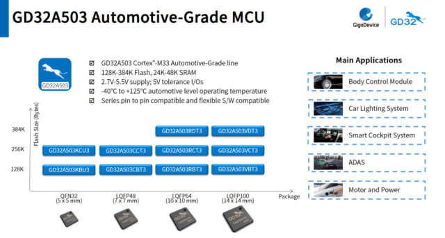 全新MCU采用先进的车规级工艺平台,遵循车规级设计理念和生产标准,符合车用高可靠性和稳定性要求。该系列产品以均衡的处理性能、丰富的外设接口和增强的安全等级,为车身控制、车用照明、智能座舱、辅助驾驶及电机电源等多种电气化车用场景提供主流开发之选。GD32A503产品组合提供了4种封装共10个型号选择,已通过前期用户验证,目前正式开放样片和开发板卡申请。