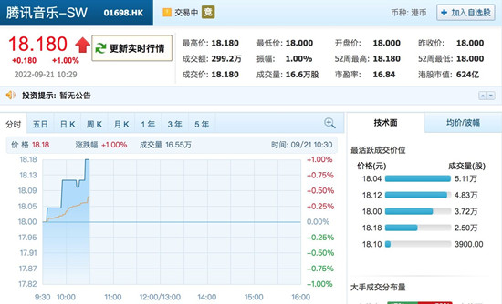 9月20日消息,今日,腾讯音乐娱乐集团以介绍上市方式正式在港交所挂牌交易,股票代码为“1698”,开盘价18港元,与发行价持平,总市值618亿港元。