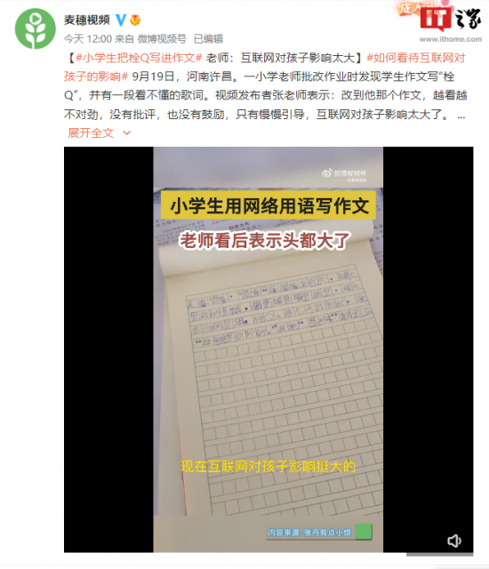 据麦穗视频报道,9 月 19 日,河南许昌一小学老师批改作业时发现学生作文写“栓 Q”,并有一段看不懂的歌词。视频发布者张老师表示称,改到他那个作文,越看越不对劲,没有批评,也没有鼓励,只有慢慢引导,互联网对孩子影响太大了。
