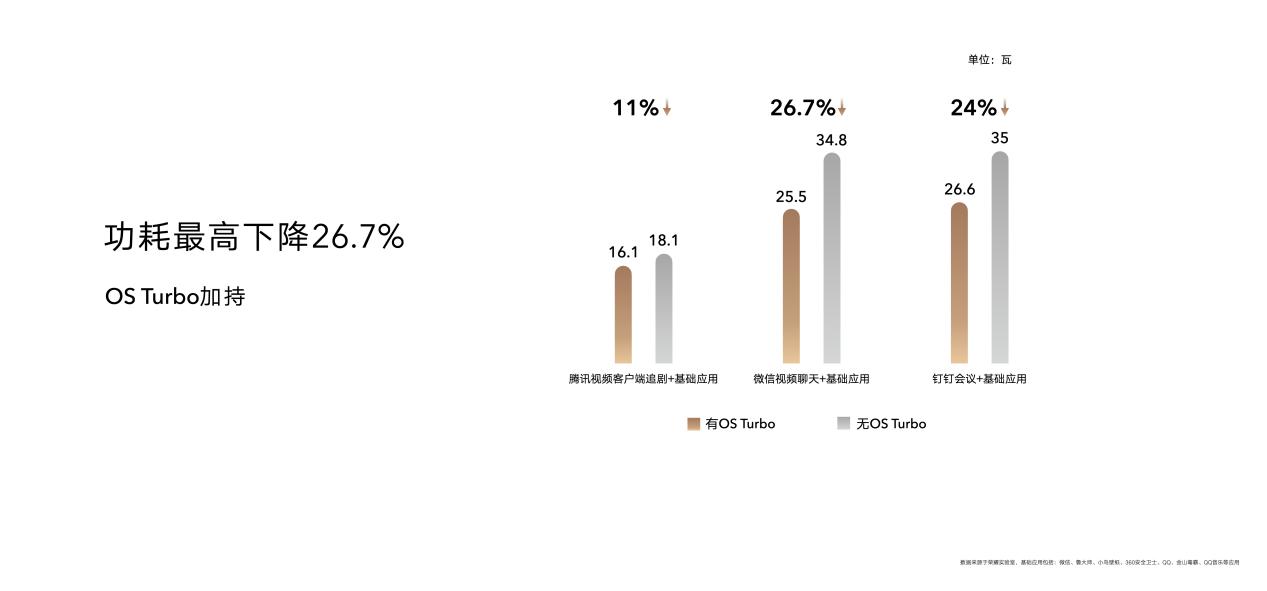 OS Turbo是荣耀从消费者痛点需求出发,带来续航和性能兼顾的最佳解决方案。在OS Turbo加持下,荣耀MagicBook V 14 2022 在钉钉会议、腾讯视频客户端追剧以及微信视频聊天等日常场景下,功耗最高下降达26。7%。