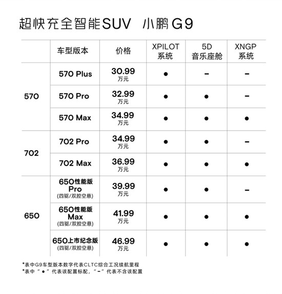 动力方面,全系标配800V高压平台及3C超快充电池包,其中,650续航各版本车型可选装4C超快充电池包,售价1万元;智能辅助驾驶方面,全系车型标配XPILOT智能辅助驾驶系统,Max版车型进一步升级为XNGP智能辅助驾驶系统,硬件增加双激光雷达,英伟达DRIVE Orin智能驾驶芯片增加为2颗,将具备全场景智能辅助驾驶能力;豪华配置方面,Pro版及以上车型标配5D音乐座舱,含XOPERA小鹏音乐厅、Nappa真皮座椅、美妆空间、智能香氛系统、主副驾腿托/按摩/律动等18项豪华配置。